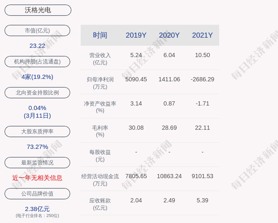 每经AI快讯,沃格光电(SH 603773,收盘价:18.98元)3月14日晚间发布年度业绩报告称,2021年营业收入约10.5亿元,同比增加73.79%;归属于上市公司股东的净利润亏损约2686万元;基本每股收益亏损0.222元。