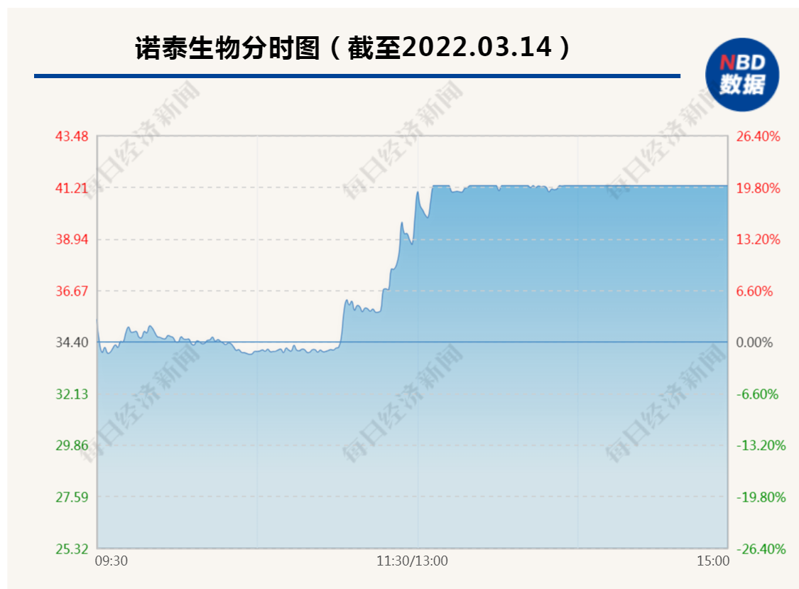 3月14日,诺泰生物发布股票交易异常波动的公告。公告称,诺泰生物股票交易连续3个交易日内(2022年3月10日、3月11日和3月14日)收盘价格涨幅偏离值累计达到30%,根据有关规定,属于股票交易异常波动情形。