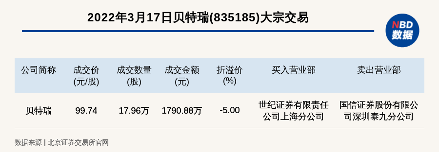 每经讯,2022年3月17日,北交所上市公司贝特瑞(835185)发生一笔大宗交易,成交价99.74元/股,成交数量17.96万股,成交金额1790.88万元,折价5%。买入营业部是世纪证券有限责任公司上海分公司,卖出营业部是国信证券股份有限公司深圳泰九分公司。
