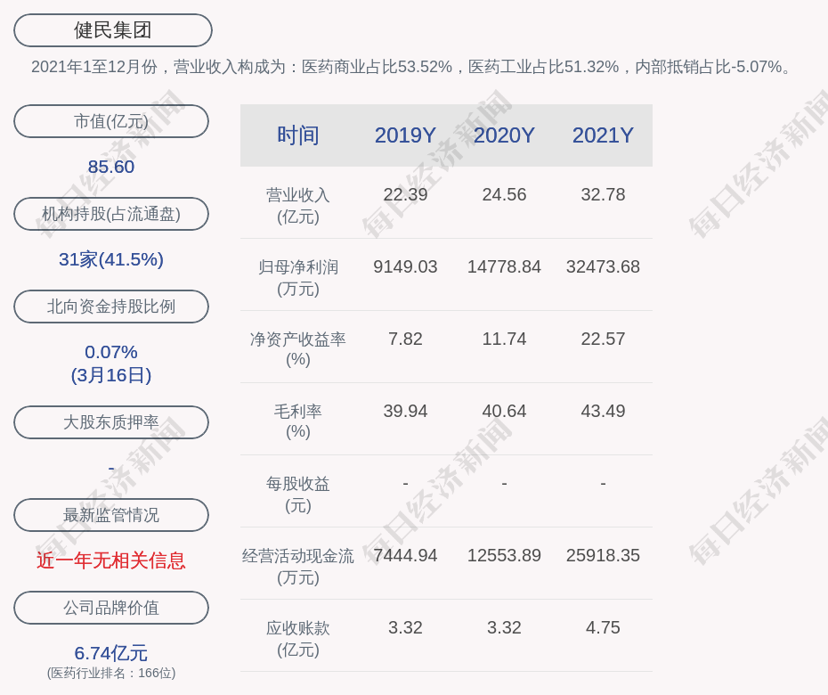 每经AI快讯,健民集团(SH 600976,收盘价:55.8元)3月17日晚间发布年度业绩报告称,2021年营业收入约32.78亿元,同比增加33.48%;归属于上市公司股东的净利润盈利约3.25亿元,同比增加119.73%;基本每股收益盈利2.13元,同比增加121.88%。分配方案为:每10股派现金红利人民币8.06元(含税)、不送红股、不转增。