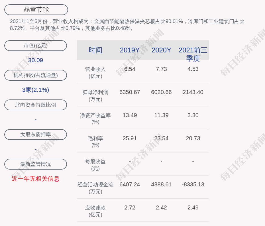 2021年1至6月份,晶雪节能的营业收入构成为:金属面节能隔热保温夹芯板占比90.01%,冷库门和工业建筑门占比8.72%,平台及其他占比0.79%,其他业务占比0.48%。