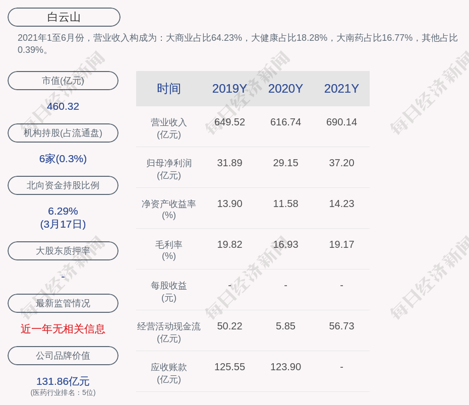 2021年1至6月份,白云山的营业收入构成为:大商业占比64.23%,大健康占比18.28%,大南药占比16.77%,其他占比0.39%。