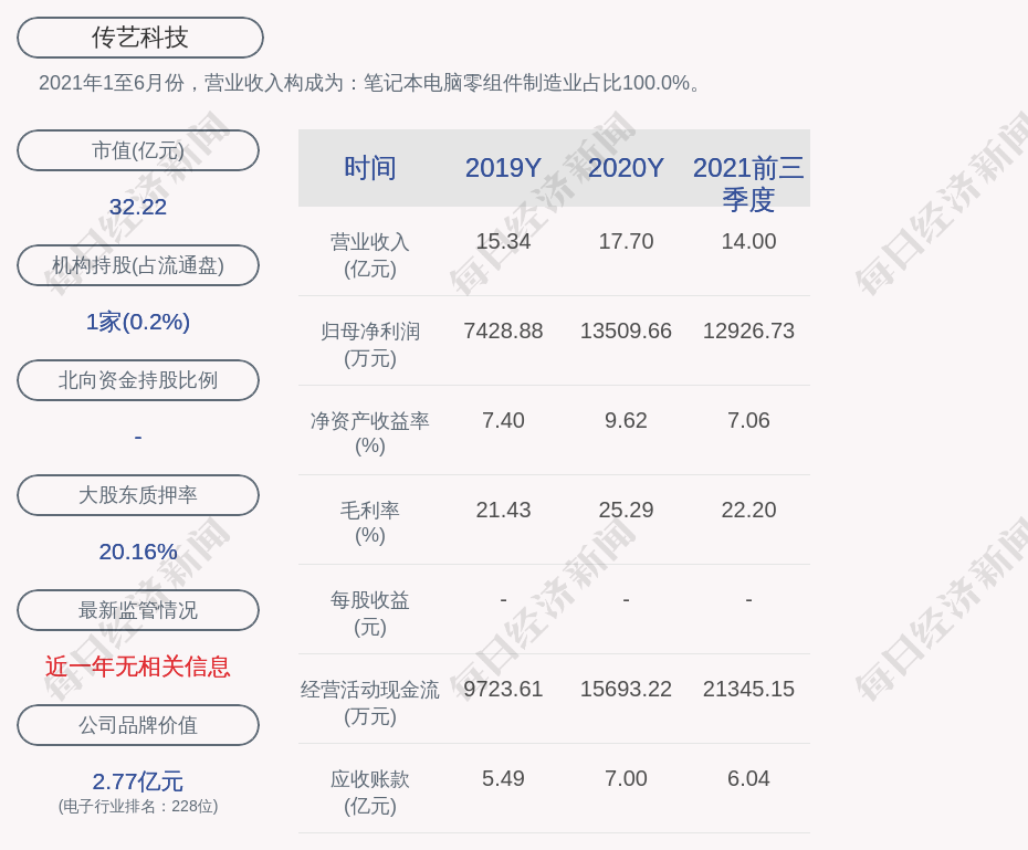 2021年1至6月份,传艺科技的营业收入构成为:笔记本电脑零组件制造业占比100.0%。