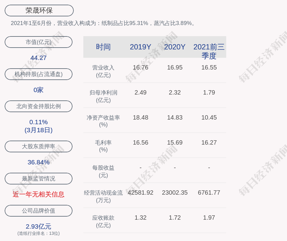 2021年1至6月份,荣晟环保的营业收入构成为:纸制品占比95.31%,蒸汽占比3.89%。