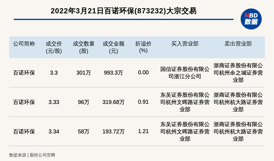 每经讯,2022年3月21日,新三板基础层公司百诺环保(873232)发生3笔大宗交易,总成交金额为1506.7万元,成交金额最高的一笔成交价3.3元/股,成交数量301万股,成交金额993.3万元,为平价交易。买入营业部是国信证券股份有限公司浙江分公司,卖出营业部是浙商证券股份有限公司杭州余之城证券营业部。