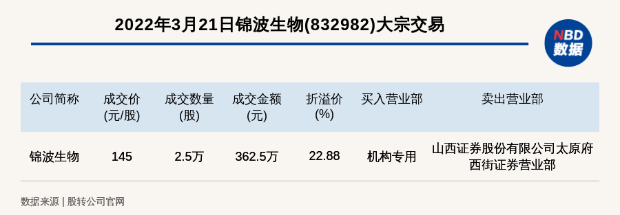 每经讯,2022年3月21日,新三板创新层公司锦波生物(832982)发生一笔大宗交易,成交价145元/股,成交数量2.5万股,成交金额362.5万元,溢价22.88%。买入营业部是机构专用,卖出营业部是山西证券股份有限公司太原府西街证券营业部。
