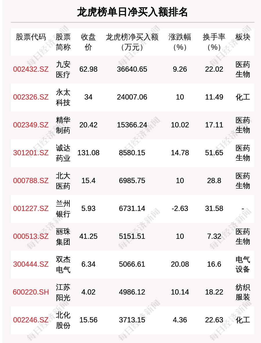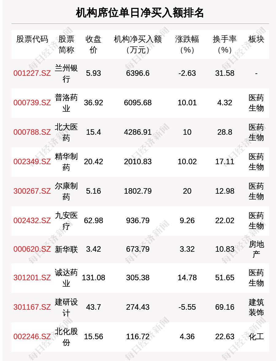 在龙虎榜中,涉及机构专用席位的个股有17只,净买入额前三的是兰州银行、普洛药业、北大医药,分别为6396.6万元、6095.68万元、4286.91万元。