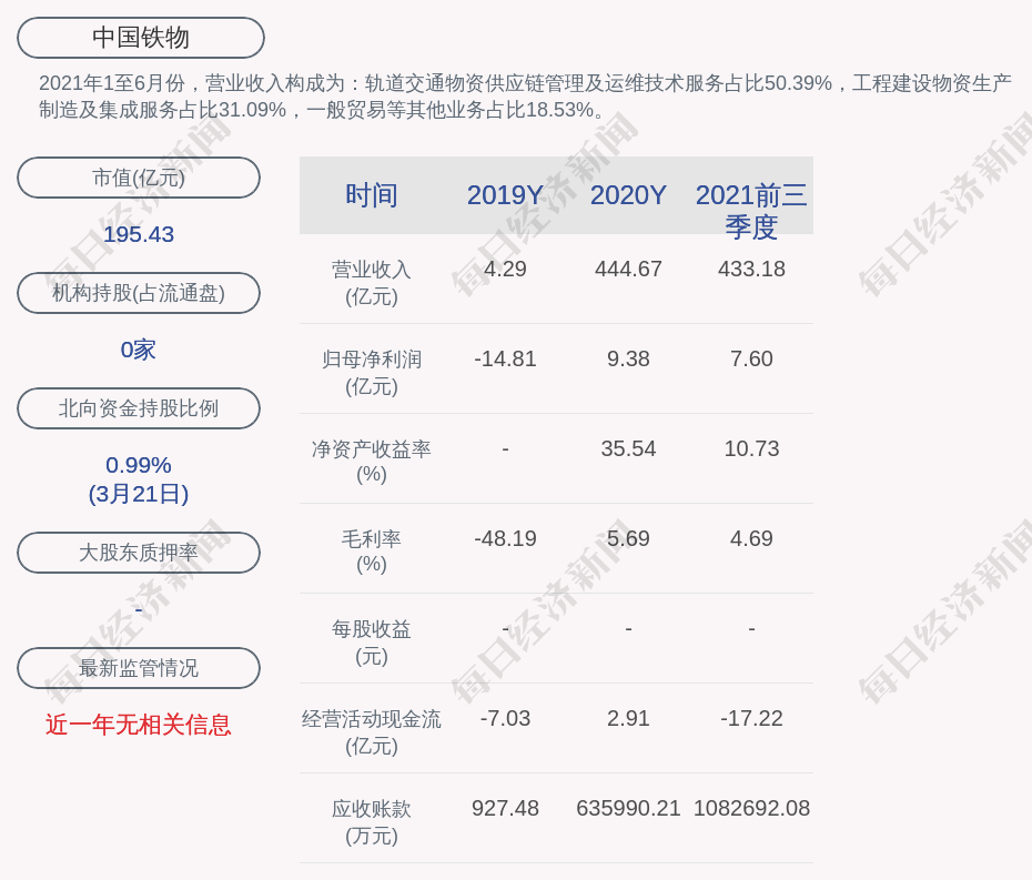 2021年1至6月份,中国铁物的营业收入构成为:轨道交通物资供应链管理及运维技术服务占比50.39%,工程建设物资生产制造及集成服务占比31.09%,一般贸易等其他业务占比18.53%。