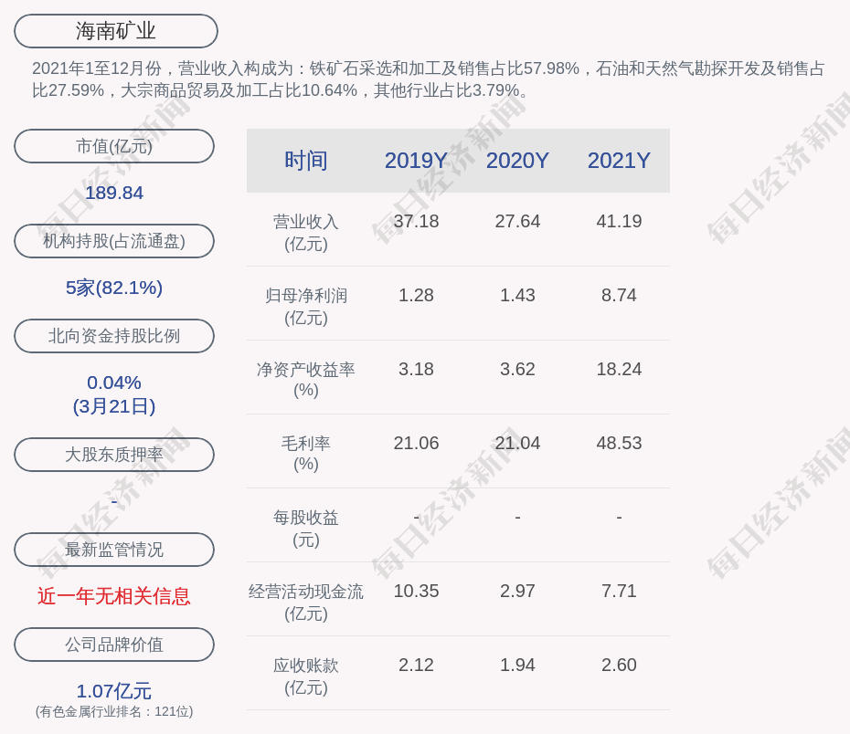 2021年1至12月份,海南矿业的营业收入构成为:铁矿石采选和加工及销售占比57.98%,石油和天然气勘探开发及销售占比27.59%,大宗商品贸易及加工占比10.64%,其他行业占比3.79%。