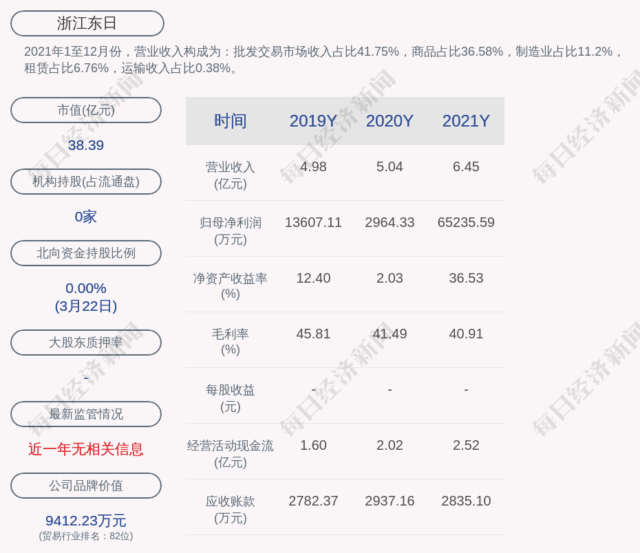 2021年1至12月份,浙江东日的营业收入构成为:批发交易市场收入占比41.75%,商品占比36.58%,制造业占比11.2%,租赁占比6.76%,运输收入占比0.38%。