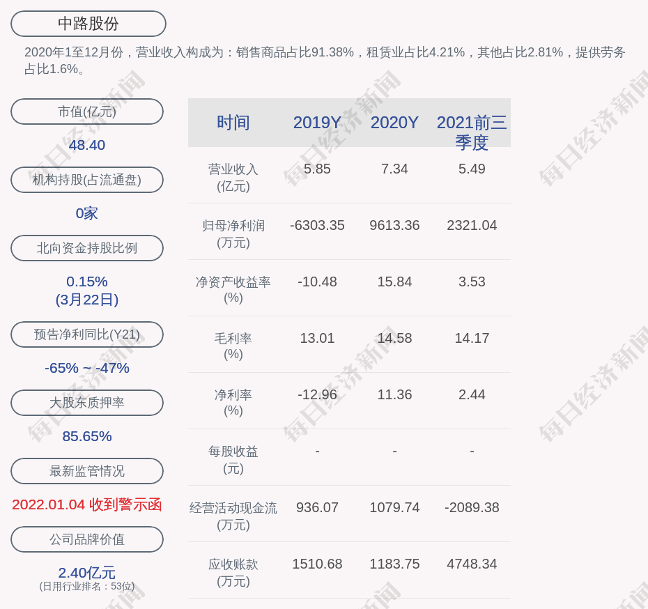 3. 中路股份在近3个交易日下跌10.91%,所属综合板块同期上涨1.67%,上证指数同期上涨0.61%。