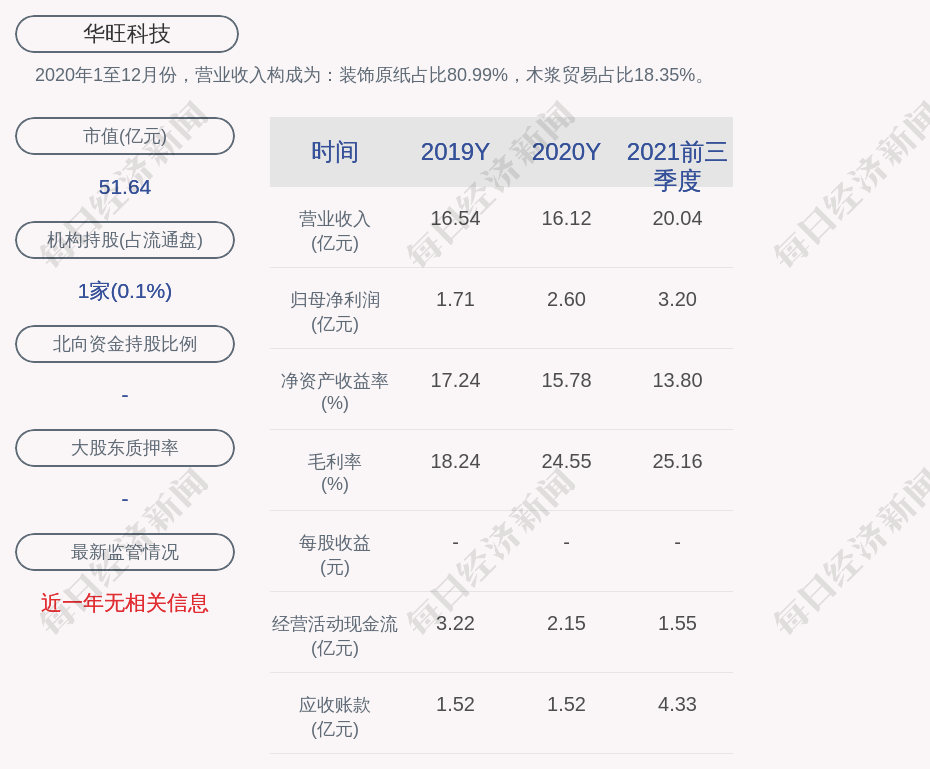 2020年1至12月份,华旺科技的营业收入构成为:装饰原纸占比80.99%,木浆贸易占比18.35%。