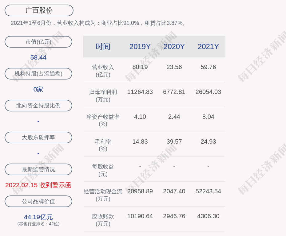 2021年1至6月份,广百股份的营业收入构成为:商业占比91.0%,租赁占比3.87%。