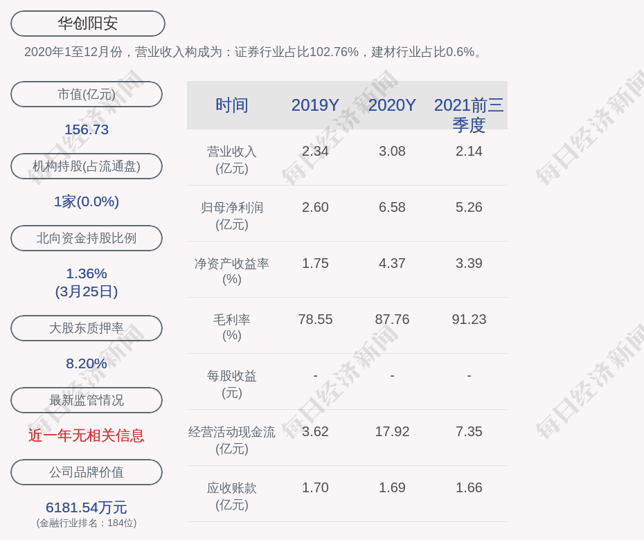 2020年1至12月份,华创阳安的营业收入构成为:证券行业占比102.76%,建材行业占比0.6%。