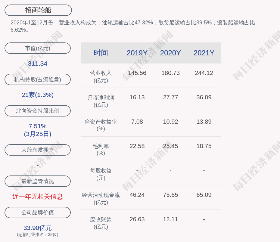 每经AI快讯,招商轮船(SH 601872,收盘价:3.84元)3月27日晚间发布年度业绩报告称,2021年营业收入约244.12亿元,同比增加12.97%;归属于上市公司股东的净利润盈利约36.09亿元,同比增加19.52%;基本每股收益盈利0.48元,同比增加6.67%。