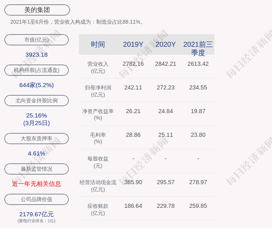 2021年1至6月份,美的集团的营业收入构成为:制造业占比88.11%。