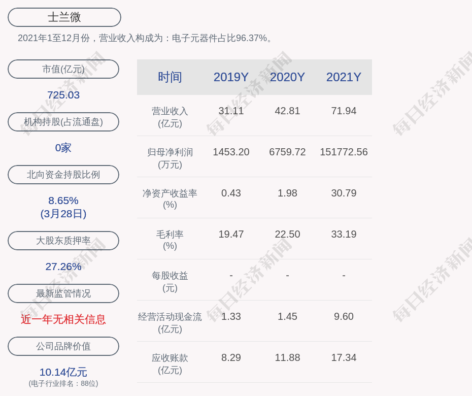 2021年1至12月份,士兰微的营业收入构成为:电子元器件占比96.37%。