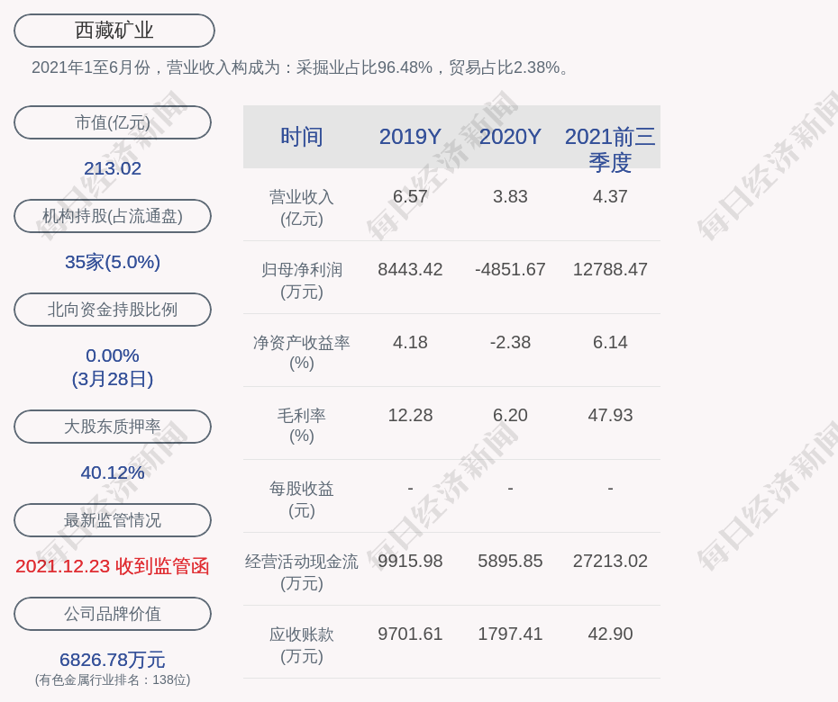 每经AI快讯,西藏矿业(SZ 000762,收盘价:40.9元)3月29日晚间发布公告称,2022年3月28日,公司收到藏华工贸出具的《关于股份减持计划届满及实施情况的告知函》,距减持计划起始日时间已满六个月,藏华工贸通过集中竞价合计减持公司股份约421万股,占公司总股本的0.81%。