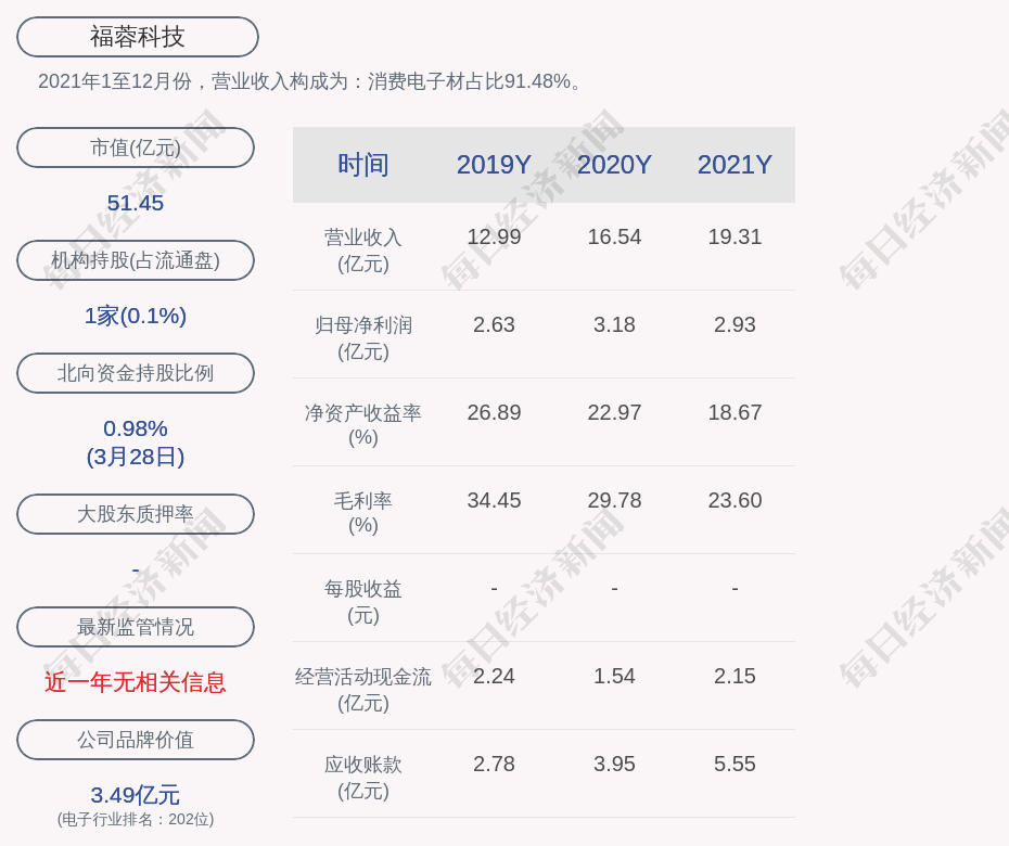 每经AI快讯,福蓉科技(SH 603327,收盘价:12.83元)3月29日晚间发布年度业绩报告称,2021年营业收入约19.31亿元,同比增加16.71%;归属于上市公司股东的净利润盈利约2.93亿元,同比减少7.7%;基本每股收益盈利0.7312元,同比减少7.7%。不送红股、不转增。