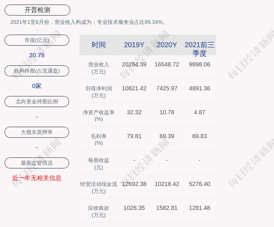 2021年1至6月份,开普检测的营业收入构成为:专业技术服务业占比99.34%。