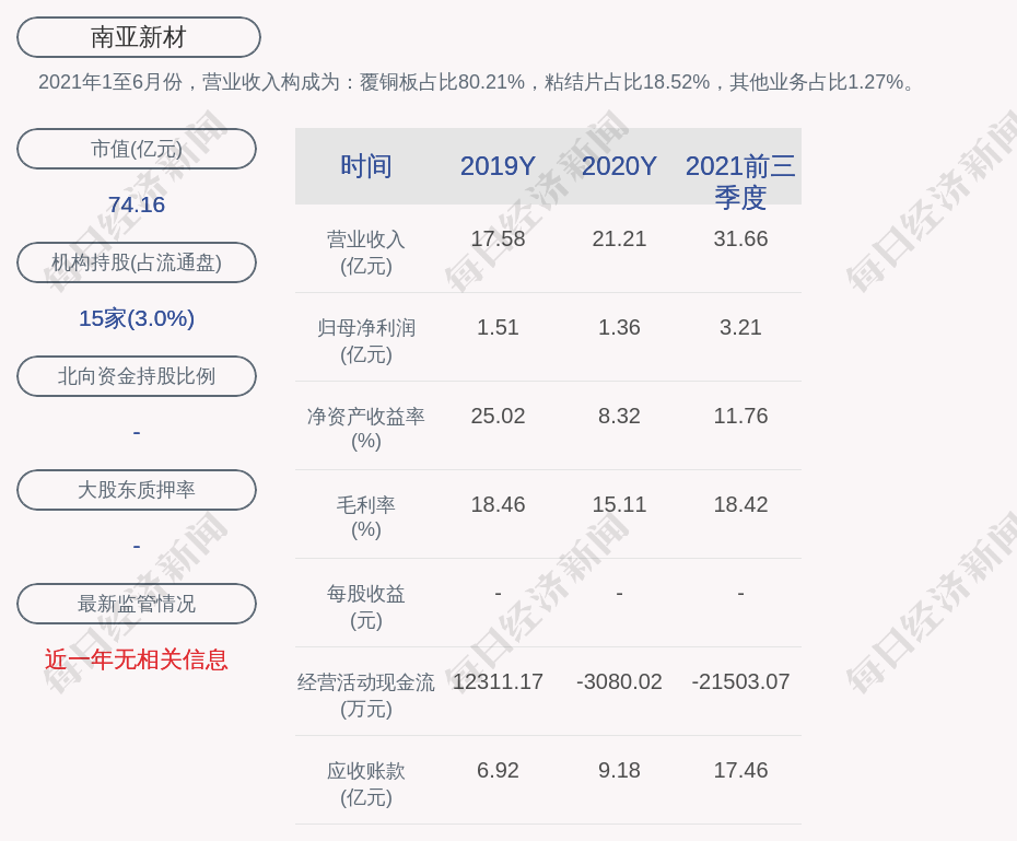 2021年1至6月份,南亚新材的营业收入构成为:覆铜板占比80.21%,粘结片占比18.52%,其他业务占比1.27%。
