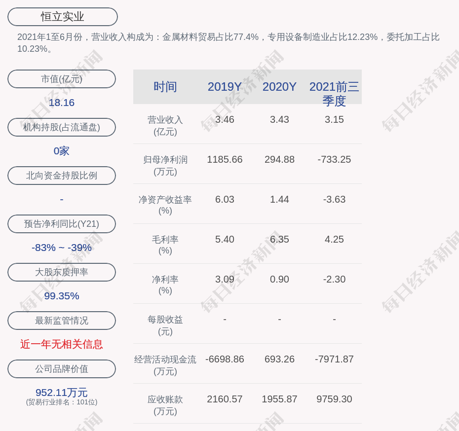 2021年1至6月份,恒立实业的营业收入构成为:金属材料贸易占比77.4%,专用设备制造业占比12.23%,委托加工占比10.23%。