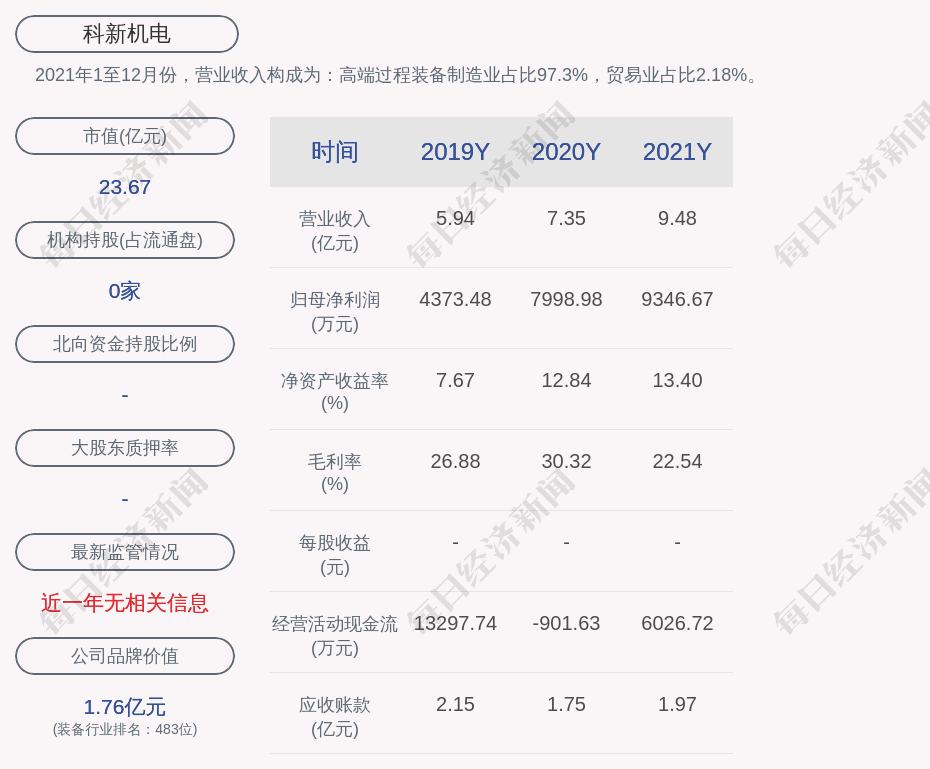 2021年1至12月份,科新机电的营业收入构成为:高端过程装备制造业占比97.3%,贸易业占比2.18%。