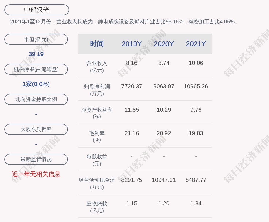 2021年1至12月份,中船汉光的营业收入构成为:静电成像设备及耗材产业占比95.16%,精密加工占比4.06%。