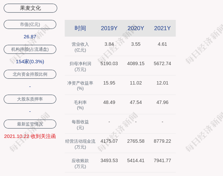每经AI快讯,果麦文化(SZ 301052,收盘价:37.3元)3月29日晚间发布年度业绩报告称,2021年营业收入约4.61亿元,同比增加29.83%;归属于上市公司股东的净利润盈利约5673万元,同比增加38.73%;基本每股收益盈利0.9449元,同比增加24.85%。拟每10股派发现金红利1.05元(含税)、不送红股、不转增。