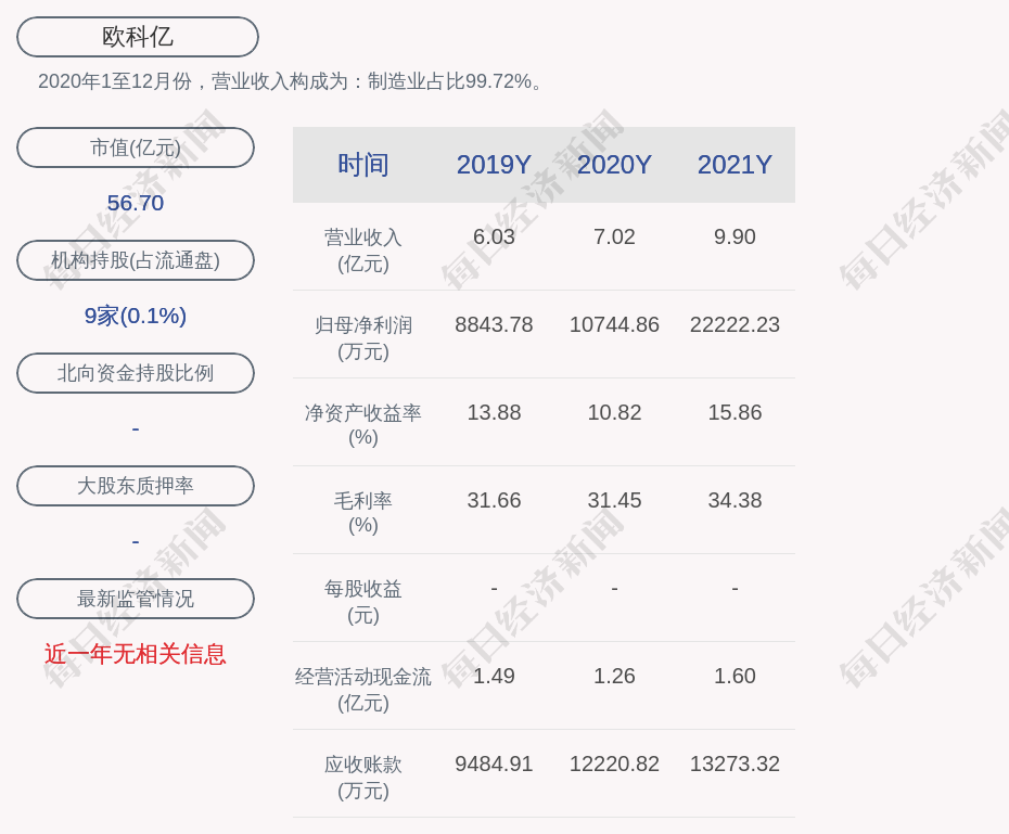 2020年1至12月份,欧科亿的营业收入构成为:制造业占比99.72%。