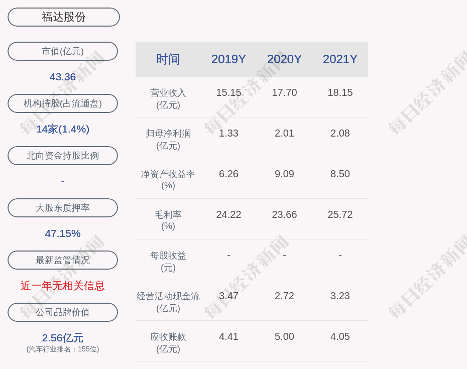 每经AI快讯,福达股份(SH 603166,收盘价:6.71元)3月29日晚间发布公告称,截至2021年12月31日,公司为全资子公司担保余额为人民币约3.33亿元,为合资公司桂林福达阿尔芬大型曲轴有限公司实际担保余额为人民币8000万元,合计担保余额占公司最近一期经审计净资产的15.67%。