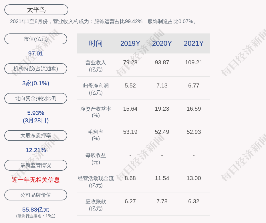 2021年1至6月份,太平鸟的营业收入构成为:服饰运营占比99.42%,服饰制造占比0.07%。