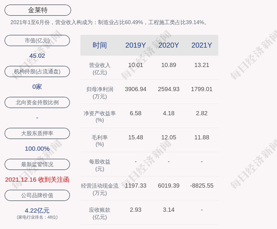 2021年1至6月份,金莱特的营业收入构成为:制造业占比60.49%,工程施工类占比39.14%。