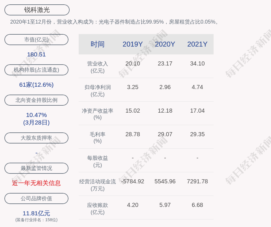 每经AI快讯,锐科激光(SZ 300747,收盘价:41.4元)3月29日晚间发布年度业绩报告称,2021年营业收入约34.1亿元,同比增加47.18%;归属于上市公司股东的净利润盈利约4.74亿元,同比增加60.17%;基本每股收益盈利1.0978元,同比增加60.17%。不分红、不送红股、以资本公积金向全体股东每10股转增3股。