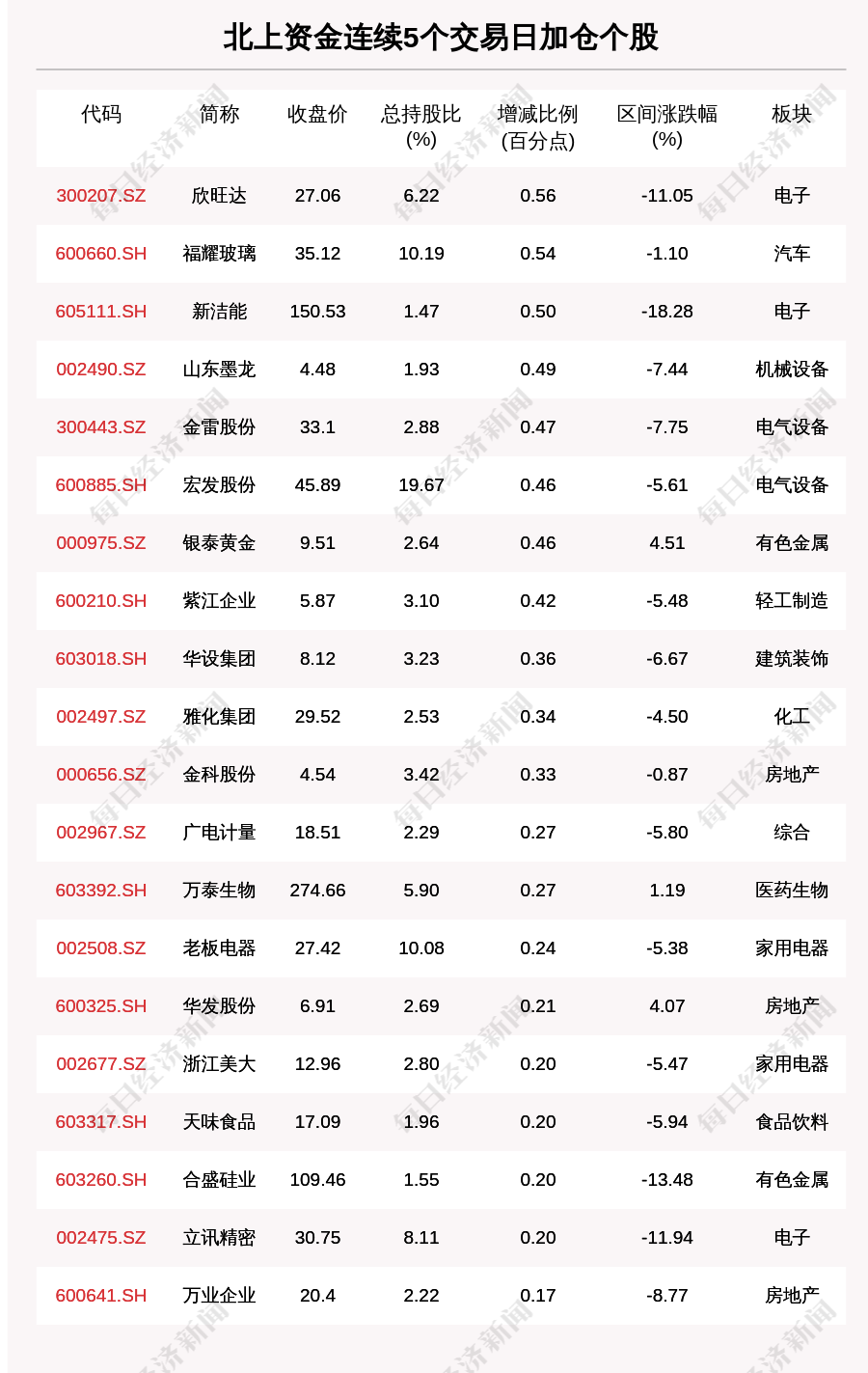 每经AI快讯,3月29日,北上资金连续5个交易日买入36个股。北上资金连续5个交易日加仓个股中,欣旺达(300207.SZ,收盘价:27.06元)增持比例增幅最大,5个交易日增持0.56个百分点,其他增持比例较大的个股包括福耀玻璃(600660.SH,收盘价:35.12元)、新洁能(605111.SH,收盘价:150.53元)、山东墨龙(002490.SZ,收盘价:4.48元),分别增持0.54个百分点、0.50个百分点、0.49个百分点。