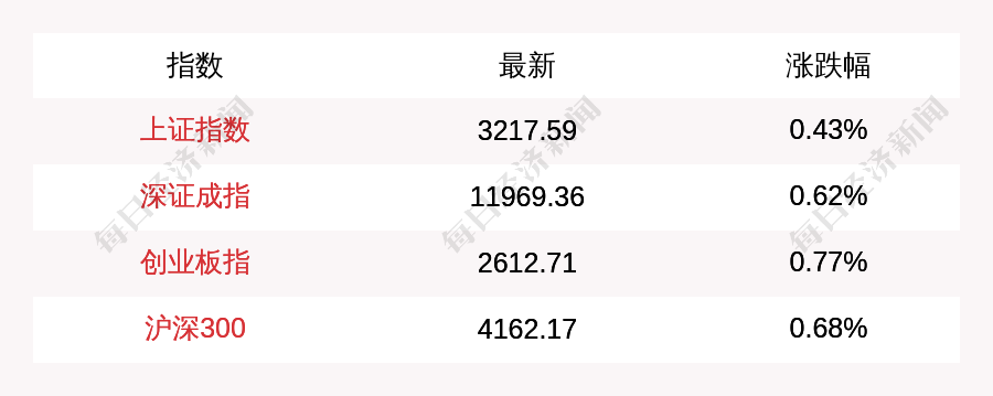 每经AI快讯:北京时间3月30日9:30,上证指数开盘上涨13.65点,涨幅为0.43%,报3217.59点;深证成指开盘上涨74.28点,涨幅为0.62%,报11969.36点;创业板指开盘上涨20.04点,涨幅为0.77%,报2612.71点;沪深300开盘上涨28.03点,涨幅为0.68%,报4162.17点。