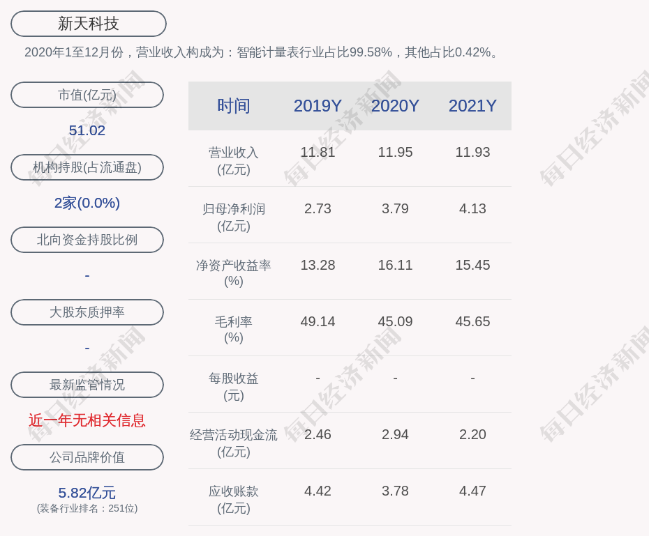 2020年1至12月份,新天科技的营业收入构成为:智能计量表行业占比99.58%,其他占比0.42%。