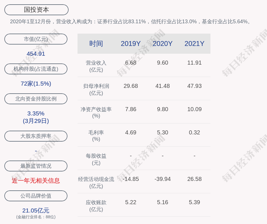 2020年1至12月份,国投资本的营业收入构成为:证券行业占比83.11%,信托行业占比13.0%,基金行业占比5.64%。
