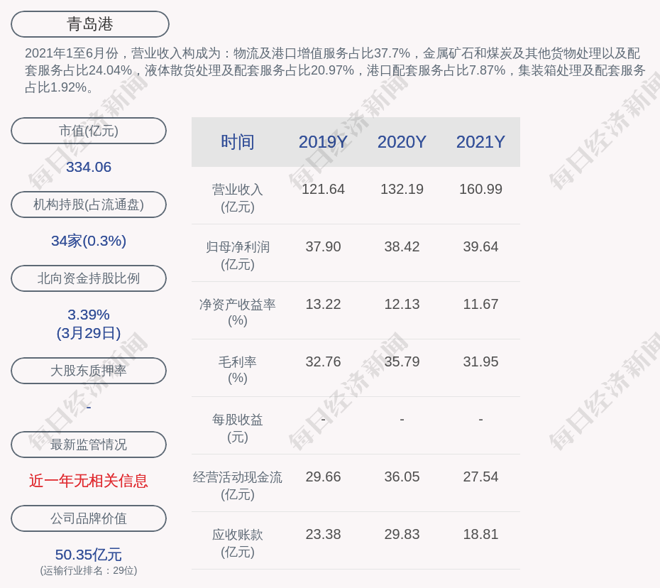 每经AI快讯,青岛港(SH 601298,收盘价:5.52元)3月30日晚间发布年度业绩报告称,2021年营业收入约160.99亿元,同比增加21.78%;归属于上市公司股东的净利润约39.64亿元,同比增加3.18%;基本每股收益0.61元,同比增加3.39%。拟每10股派发现金红利约2.56元(含税)、不送红股、不转增。