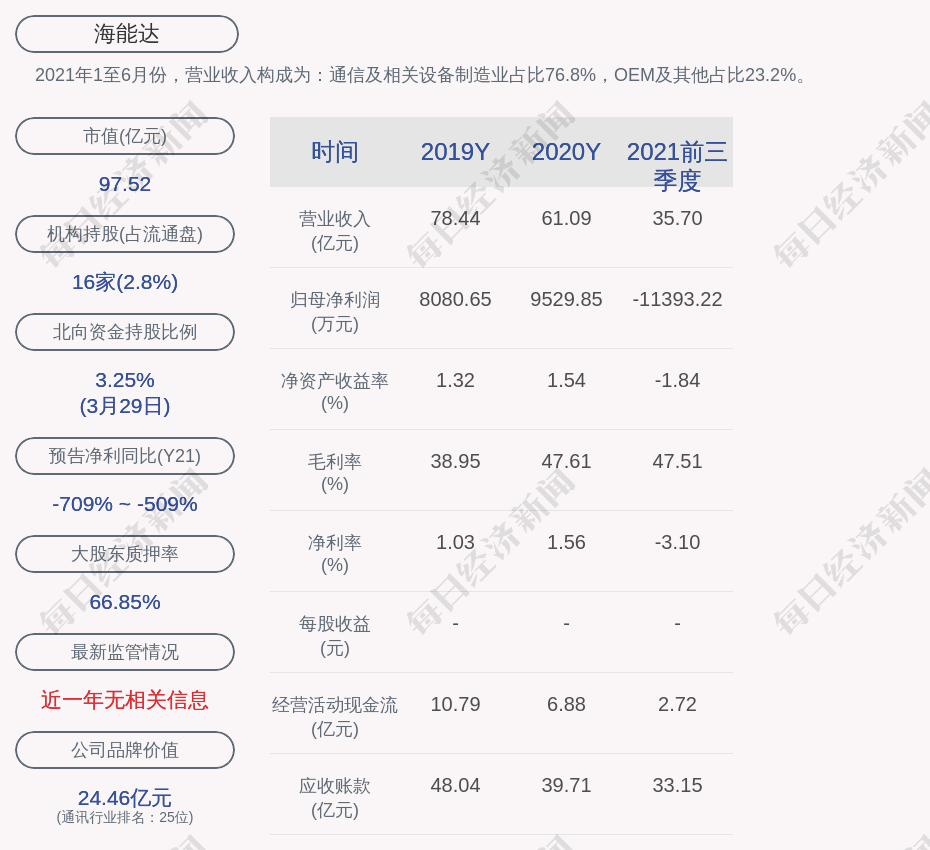 每经AI快讯,海能达(SZ 002583,收盘价:5.37元)3月30日晚间发布公告称,截至本公告日,陈清州先生所持有公司股份累计质押约5.05亿股,占其所持公司股份总数的66.06%;翁丽敏女士所持有公司股份累计质押1144万股,占其持有公司股份总数的65%。双方累计质押合计约5.17亿股,占其共同持有公司股份总数的66.04%。