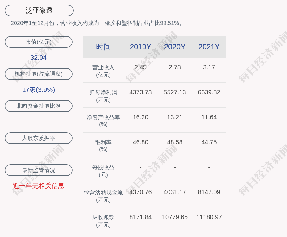 每经AI快讯,泛亚微透(SH 688386,收盘价:45.77元)3月30日晚间发布年度业绩报告称,2021年营业收入约3.17亿元,同比增加14%;归属于上市公司股东的净利润约6640万元,同比增加20.13%;基本每股收益0.95元,同比减少5%。不派发现金红利、不送红股、不转增。
