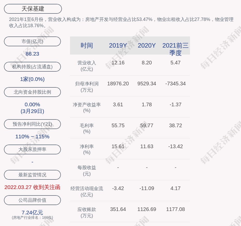 2021年1至6月份,天保基建的营业收入构成为:房地产开发与经营业占比53.47%,物业出租收入占比27.78%,物业管理收入占比18.76%。