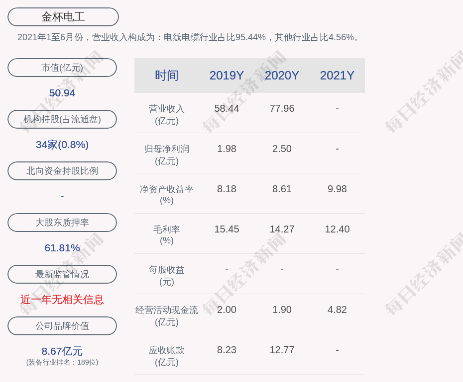 2021年1至6月份,金杯电工的营业收入构成为:电线电缆行业占比95.44%,其他行业占比4.56%。