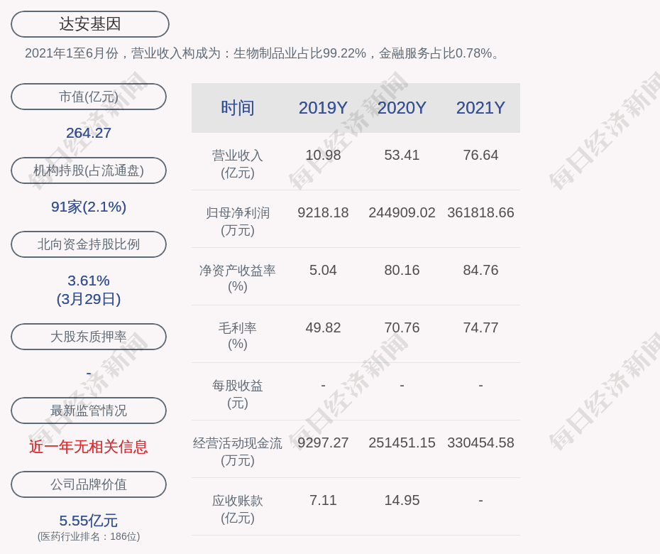 2021年1至6月份,达安基因的营业收入构成为:生物制品业占比99.22%,金融服务占比0.78%。