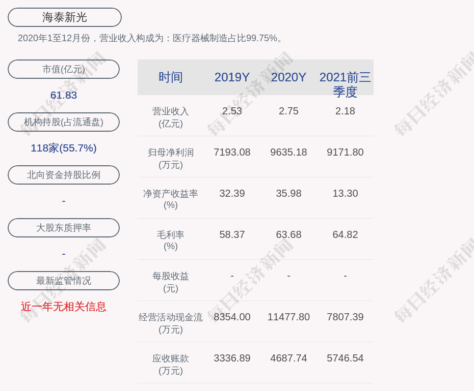 2020年1至12月份,海泰新光的营业收入构成为:医疗器械制造占比99.75%。