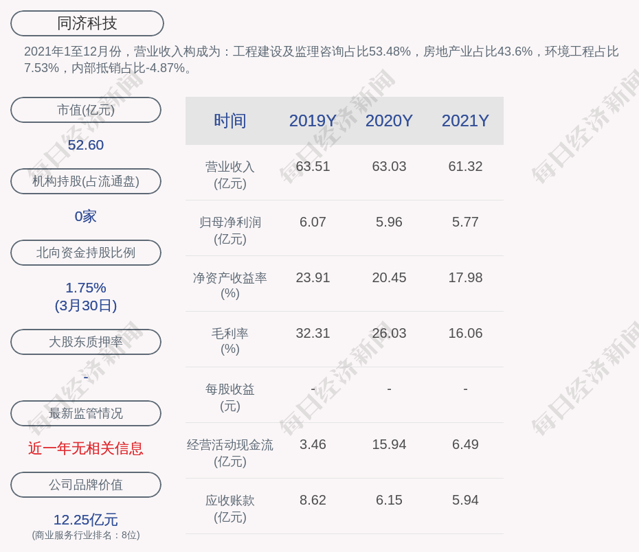 2021年1至12月份,同济科技的营业收入构成为:工程建设及监理咨询占比53.48%,房地产业占比43.6%,环境工程占比7.53%,内部抵销占比-4.87%。