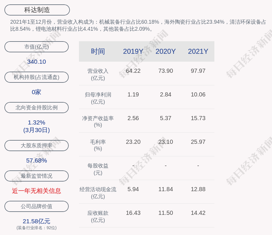 2021年1至12月份,科达制造的营业收入构成为:机械装备行业占比60.18%,海外陶瓷行业占比23.94%,清洁环保设备占比8.54%,锂电池材料行业占比4.41%,其他装备占比2.09%。