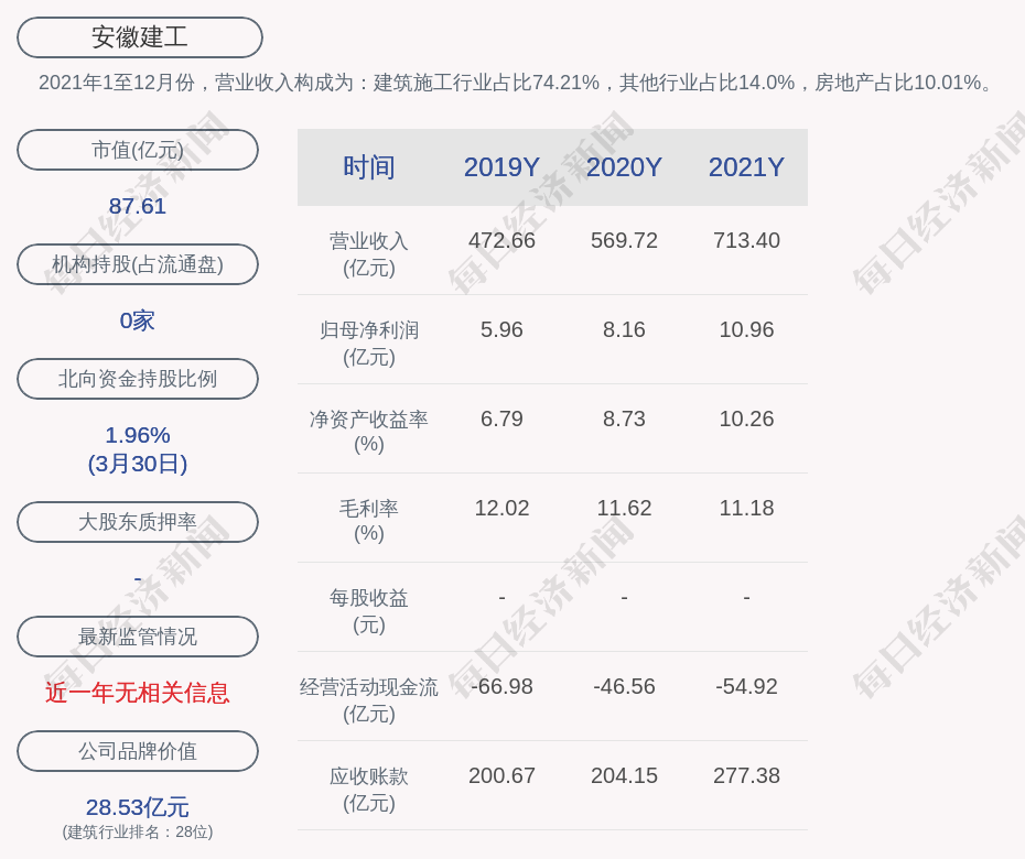 每经AI快讯,安徽建工(SH 600502,收盘价:5.09元)3月31日晚间发布年度业绩报告称,2021年营业收入约713.4亿元,同比增加25.22%;归属于上市公司股东的净利润约10.96亿元,同比增加34.32%;基本每股收益0.64元,同比增加36.17%。