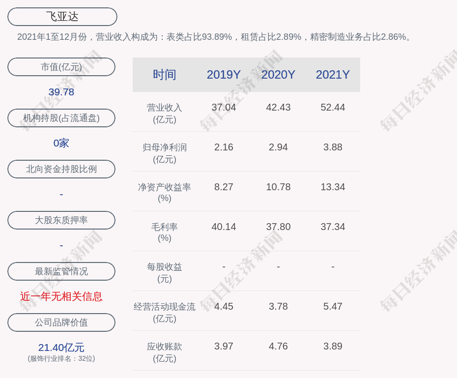 2021年1至12月份,飞亚达的营业收入构成为:表类占比93.89%,租赁占比2.89%,精密制造业务占比2.86%。