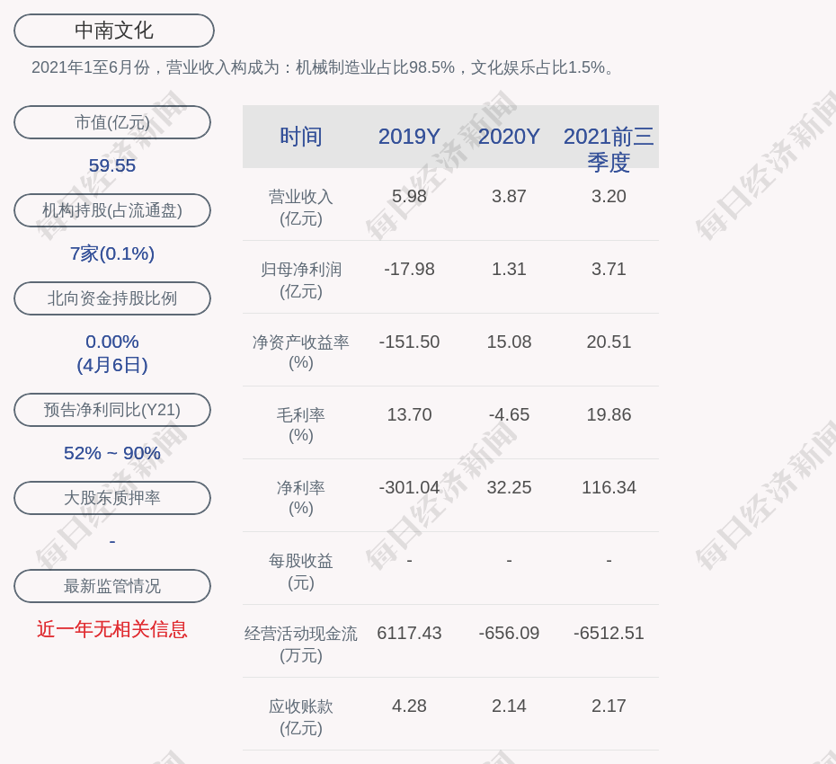 2021年1至6月份,中南文化的营业收入构成为:机械制造业占比98.5%,文化娱乐占比1.5%。